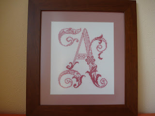 La inicial de mi nombre, para ponerla sobre la mesilla, bordada en lino con dos tonos de rosa.